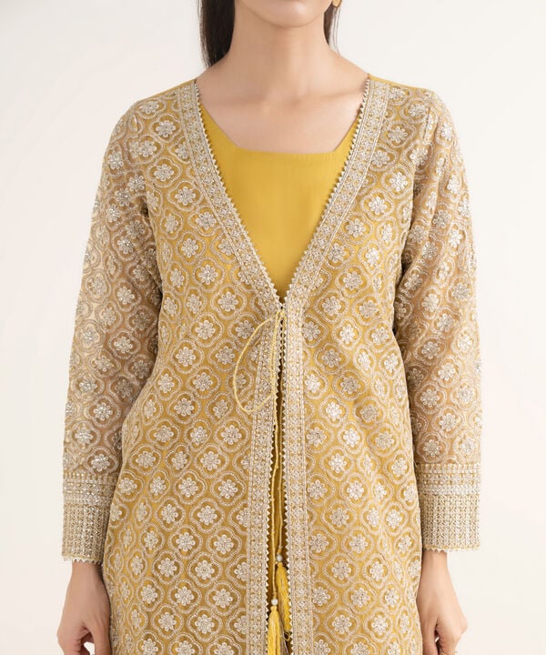 Make a statement in our embroidered yellow blended organza front open shirt with dyed inner slip paired with a matching blended net dupatta.