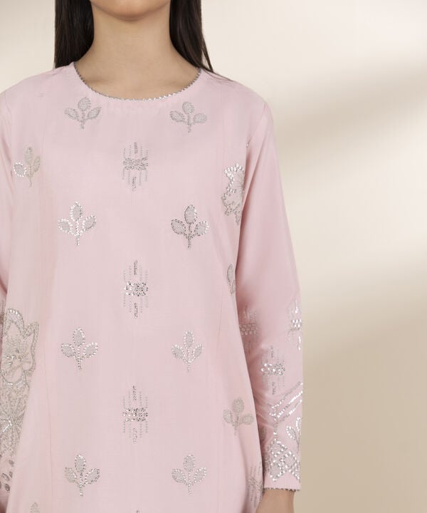 Make a statement in our embroidered light pink chambray shirt and cotton trousers ensemble with a blended chiffon dupatta.