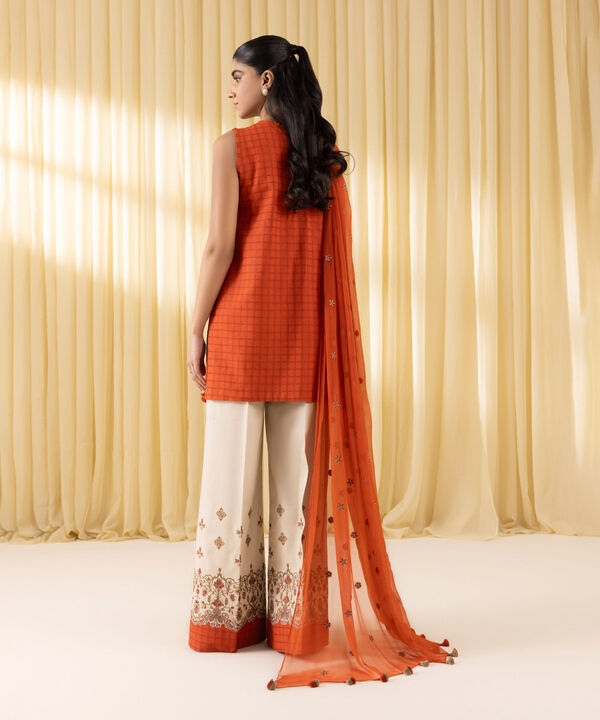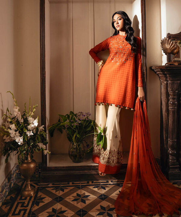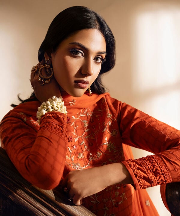 Make a statement in our embroidered orange and beige dobby shirt and cotton trousers ensemble with a crinkle chiffon dupatta.