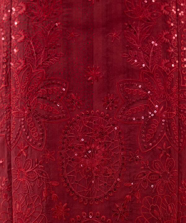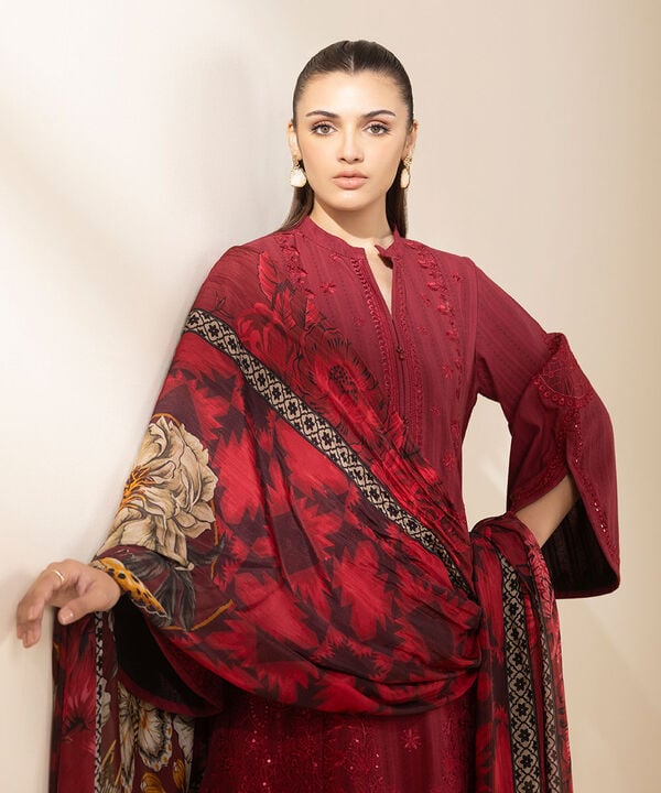 Make a statement in our embroidered red dobby three piece suit paired with a bemberg tissue dupatta.
