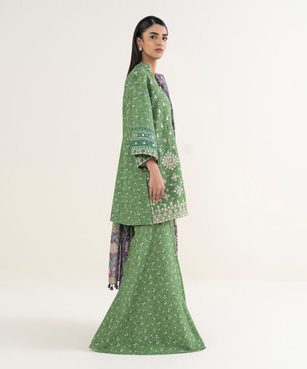 Make a sophisticated statement with our three-piece embroidered green ensemble featuring a khaddar shirt paired with khaddar trousers and a khaddar dupatta.