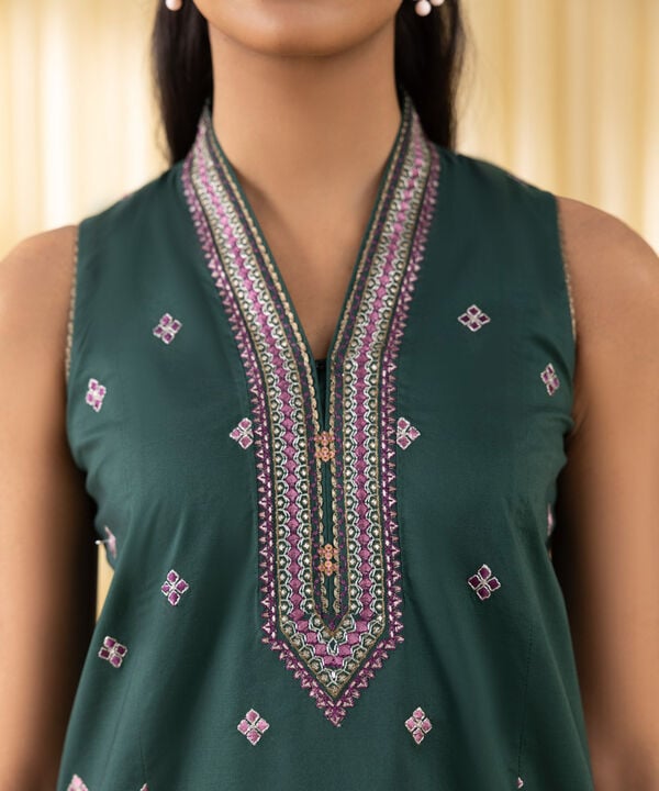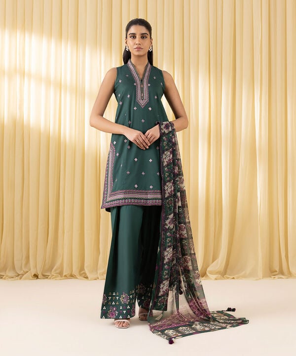 Make a statement in our embroidered green textured lawn shirt and cotton trousers ensemble with a multi-coloured blended chiffon dupatta.