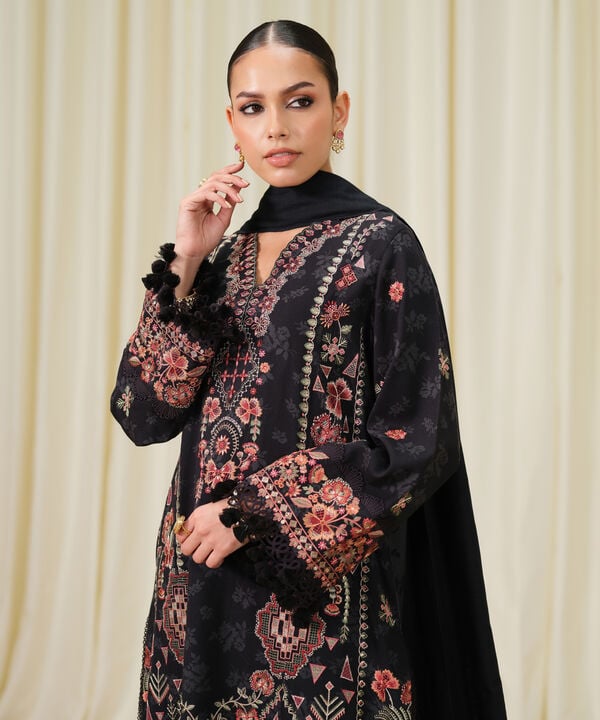 Shop SAPPHIRE online for ladies unstitched 3 PC embroidered grey and black twill ensemble 0ESD25V1012B from Unstitched Winter '25 new arrivals