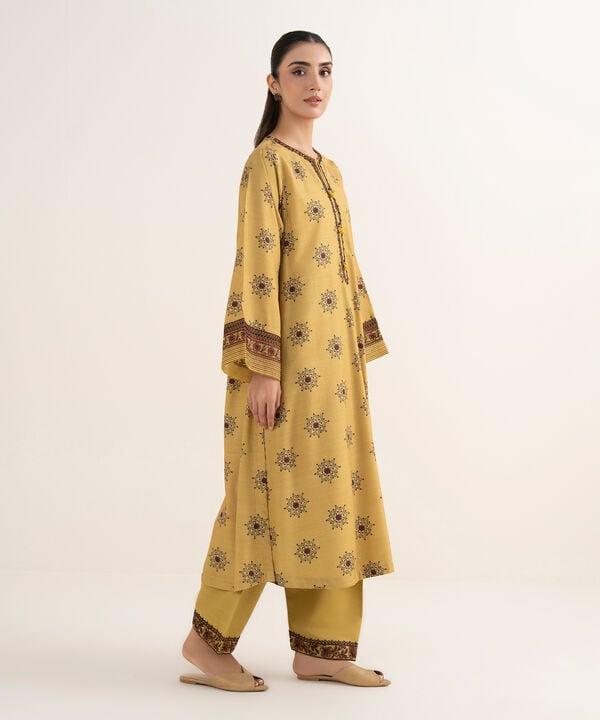 Upgrade your wardrobe in our embroidered mustard herringbone A-line shirt featuring a round neckline with slit.