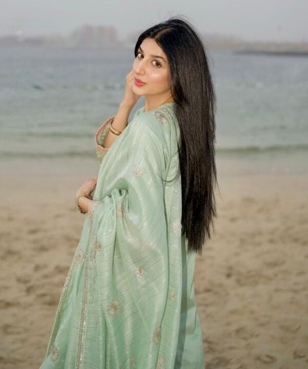 Upgrade your wardrobe in our embroidered mint green self jacquard leno A-line shirt featuring a round neckline with slit.