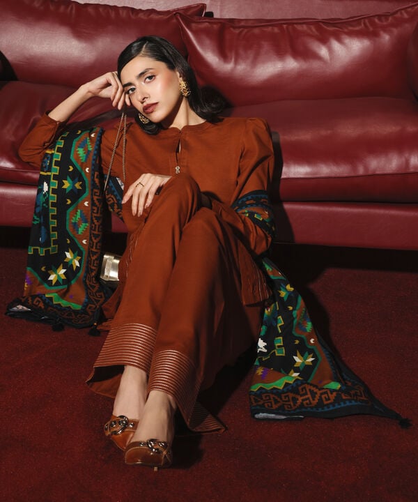 Perfect your style with our dyed brown khaddar A-line shirt featuring a round neckline.